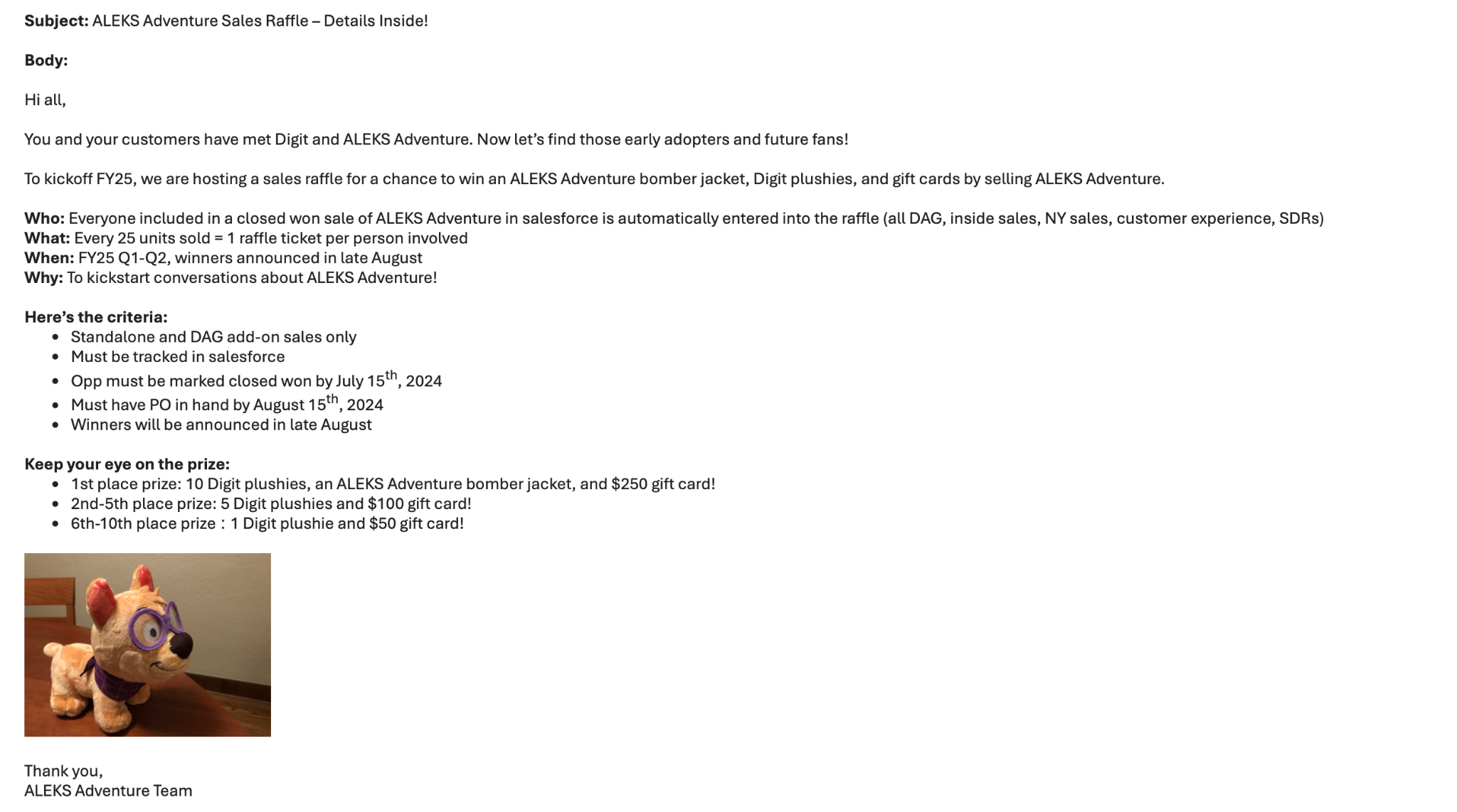 Creativity: Used the “Digit the Dog” plushie as incentive for sales team contest, demos with customers, giveaways at conferences, and a salable add on