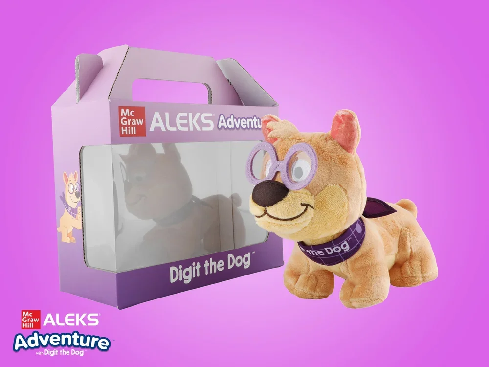 Position the ALEKS Adventure in-game companion (Digit the Dog) as a brand mascot, bridging the digital learning experience with physical merchandise to drive awareness and engagement